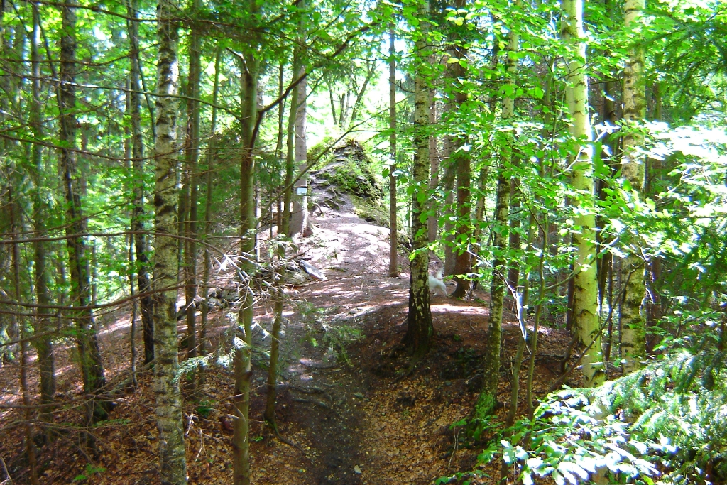Hrad Nístějka - pohled od hradního příkopu. Hrad Nístějka - zbytky hlavní věže. Hrad Nístějka - skalní blok se zbytky zdiva.